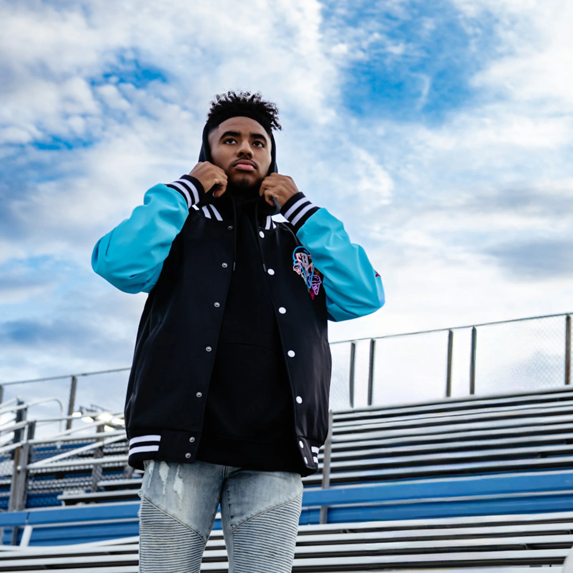 - Premium Design: Black body with electric blue sleeves, striped ribbed collar, cuffs, and hem for a classic varsity feel.